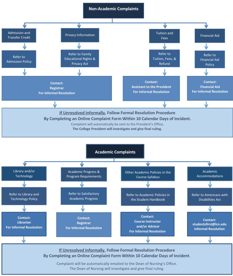 - Step 1 - Informal Resolution for Complaints. Within three (3) calendar days after the concern arises, the complaining student must first attempt to resolve their concerns informally with the LCN student, staff, and/or faculty member who is the subject of the complaint. The purpose of addressing concerns directly and informally with the individual(s) involved is to achieve resolution by clarifying the perceived problem and requesting specific action. Suppose the complaining student has already talked to the appropriate faculty or staff member without resolution or is apprehensive about talking to the person involved. In that case, the student may contact studentsfirst@lcn.edu and/or an academic advisor for assistance and support with this step.